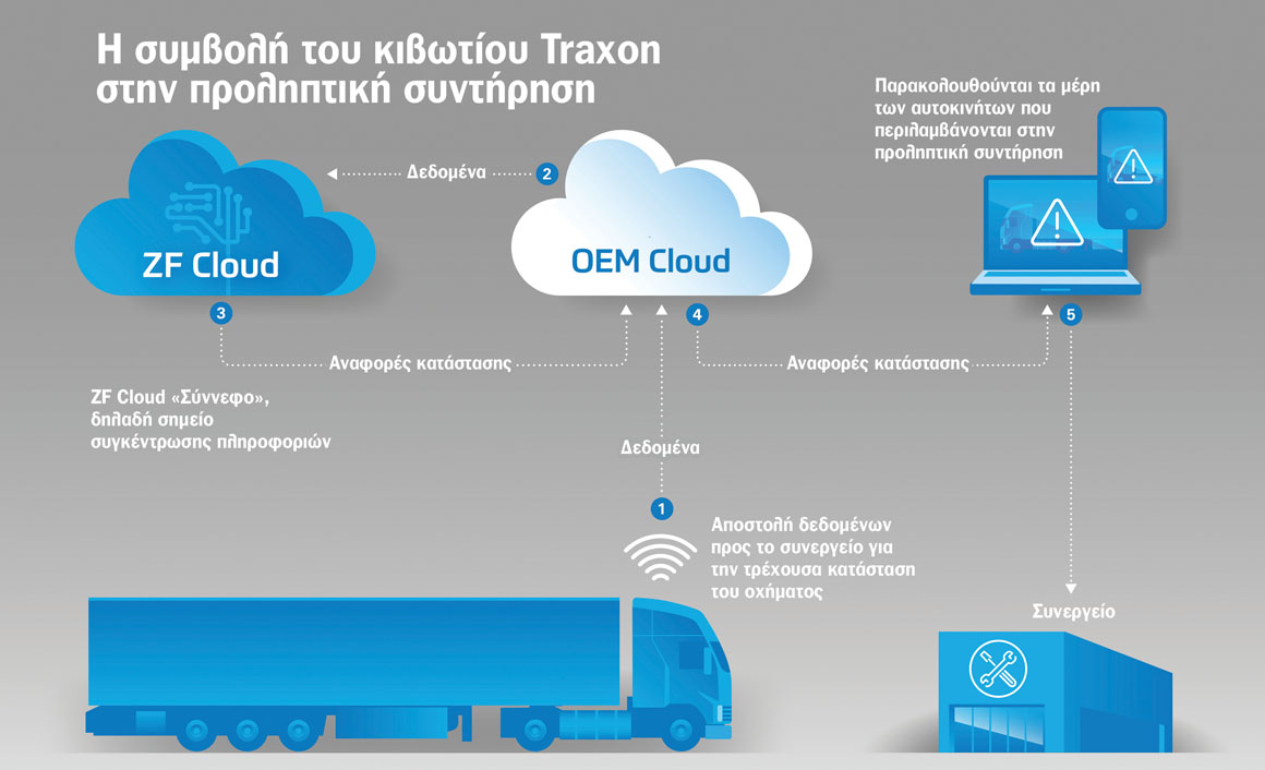 Η πιο οφθαλμοφανής και επικερδής για τη Μεταφορά μορφή συνδεσιμότητας τελευταίας γενιάς, είναι η δυνατότητα προληπτικής συντήρησης, η οποία είναι πρακτικά διαθέσιμη σε όλα τα φορτηγά και λεωφορεία που μπορεί να αγοράσει κανείς σήμερα, και στη χώρα μας. Τη συγκεκριμένη δυνατότητα την προσφέρουν όλοι ανεξαιρέτως οι κατασκευαστές, και τελείως περιγραφικά, λειτουργεί ως εξής: Αποθηκεύοντας συνεχώς δεδομένα στο «cloud» για την κατάσταση της γραμμής μετάδοσης του οχήματος, οι υπολογιστικές μονάδες του οχήματος μεταδίδουν συνεχώς δεδομένα (data) για κρίσιμα εξαρτήματα όπως λ.χ. το κιβώτιο ταχυτήτων. Αν διαγνωστεί επικείμενη βλάβη, οι τεχνικοί σε οποιοδήποτε συνεργείο του δικτύου του κατασκευαστή, μπορούν να κρίνουν αν το φορτηγό μπορεί να συνεχίσει να κινείται μέχρι να φτάσει στον πελάτη, ή πρέπει να μεταβεί άμεσα προς επισκευή. Σκοπός είναι να απαλειφθούν πλήρως οι ακινητοποιήσεις και οι βλάβες, και τα οφέλη δε χρειάζονται περαιτέρω ανάλυση. Επίσης, τα ηλεκτρονικά προσπαθούν συνεχώς να «πακετάρουν» τις εργασίες συντήρησης, για να μην πηγαινοέρχεσαι συνέχεια στο συνεργείο: αν ένα φίλτρο θέλει αλλαγή, θα κρίνουν αν αντέχει μέχρι το επόμενο προγραμματισμένο σέρβις όπου, π.χ. θα αλλαχθούν αναλώσιμα του συστήματος πέδησης.