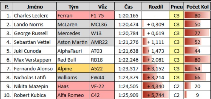 Μετά από 70 λεπτά, στην κορυφή των χρόνων βρισκόταν ο Charles Leclerc με Ferrari με χρόνο 1:21.718 με τη C2. Ο Lando Norris ανέβηκε, μετά τη συμπλήρωση 1 ώρας, στη 2η θέση, έχοντας διαφορά 0,773s από τη Ferrari με τη C2 επίσης. Πίσω του ήταν οι George Russell με Mercedes (+0,937s) και Yuki Tsunoda με AlphaTauri (+0,974s), αμφότεροι με C3. Την κατάταξη συμπλήρωναν οι Max Verstappen με Red Bull, Fernando Alonso με Alpine και Sebastian Vettel με Aston Martin.