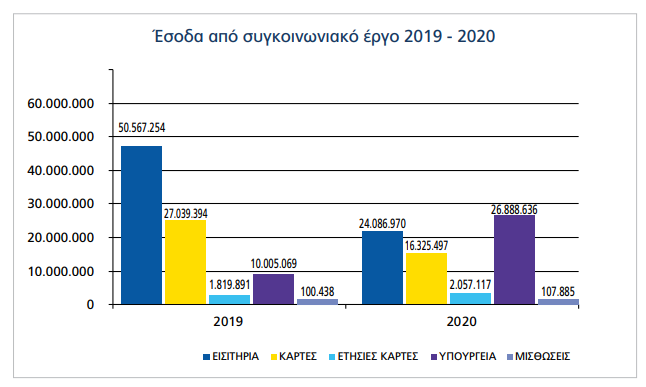 Το ποσό της κρατικής επιχορήγησης ανέρχεται στα 130.513.331 ευρώ έναντι του ποσού των 135.673.490 ευρώ, που η εταιρεία έλαβε για το έτος 2019 (-3,8%). Το έτος 2020 η εταιρεία έλαβε έκτακτη επιχορήγηση 18.858.682 ευρώ για τα διαφυγόντα έσοδα λόγω της πανδημίας covid_19 , επιχορήγηση ποσού 1.595.346 ευρώ για δαπάνες covid, 876.719 ευρώ για αποπληρωμή ληξιπρόθεσμων υποχρεώσεων προς τη ΔΕΗ και 13.182.585 ευρώ για αποπληρωμή των ληξιπρόθεσμων υποχρεώσεων της. Η τακτική επιχορήγηση ανήλθε στα 96.000.000 ευρώ.