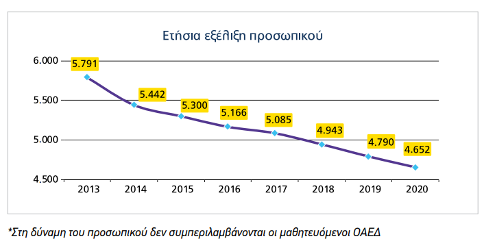 Η απουσία προσλήψεων κατά τα χρόνια των μνημονίων είχε αντίκτυπο και στη σύσταση του προσωπικού αφού οι εργαζόμενοι κάτω των 35 ετών είναι μόλις 9, δηλαδή το 0,9% του προσωπικού. Στην κατηγορία από 36 έως 50 έτη ανήκει το μεγαλύτερο μέρος του προσωπικού (2.612 άτομα) με ποσοστό 56,1%, μειωμένο κατά 11,4% σε σχέση με το 2019. Τέλος η κατηγορία των υπαλλήλων που ξεπερνούν τα 50 έτη αθροίζει στα 2.031 άτομα, δηλαδή 43,7% του συνόλου των εργαζομένων, αυξημένο σε σχέση με το 11,7% το προηγούμενο έτος.