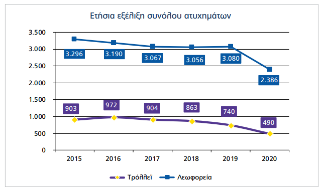 Το σύνολο των ατυχημάτων για το έτος 2020 ανέρχεται σε 2.876 συνολικά για τα θερμικά λεωφορεία και τα ηλεκτροκίνητα οχήματα (2.386 για λεωφορεία και 490 για τρόλεϊ) έναντι 3.820 ατυχημάτων το 2019. Πρόκειται για αριθμός σημαντικά μειωμένο σε σχέση με τα προηγούμενα χρόνια, ακολουθώντας τη γενικότερη μείωση των οδικών ατυχημάτων το πρώτο έτος της πανδημίας.